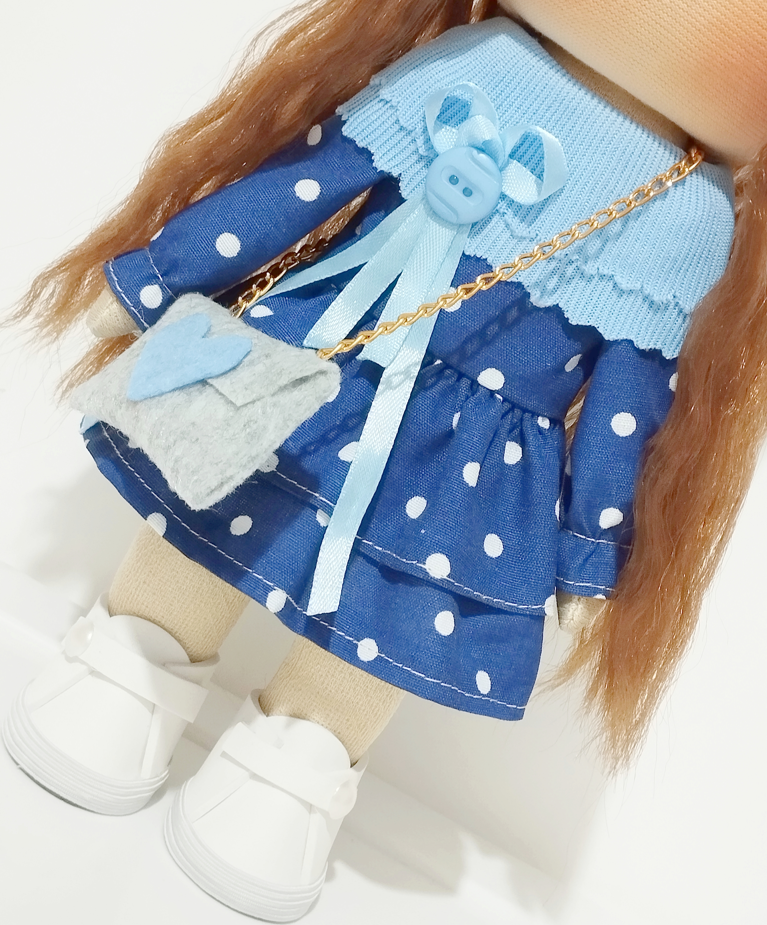 💙عروسک روسی دخترانه سرچرخشی(پیراهن خالدار سورمه ای)🩵(ارسال رایگان)